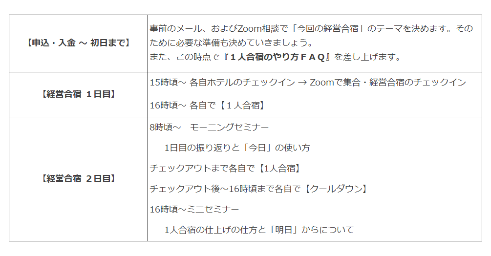 入金の時点で『1人経営合宿のやり方FAQ』を差し上げます。その内容を読むだけでも効果的な1人経営合宿のやり方のイメージが手に入ります。例えばこんなことについて説明してあります。